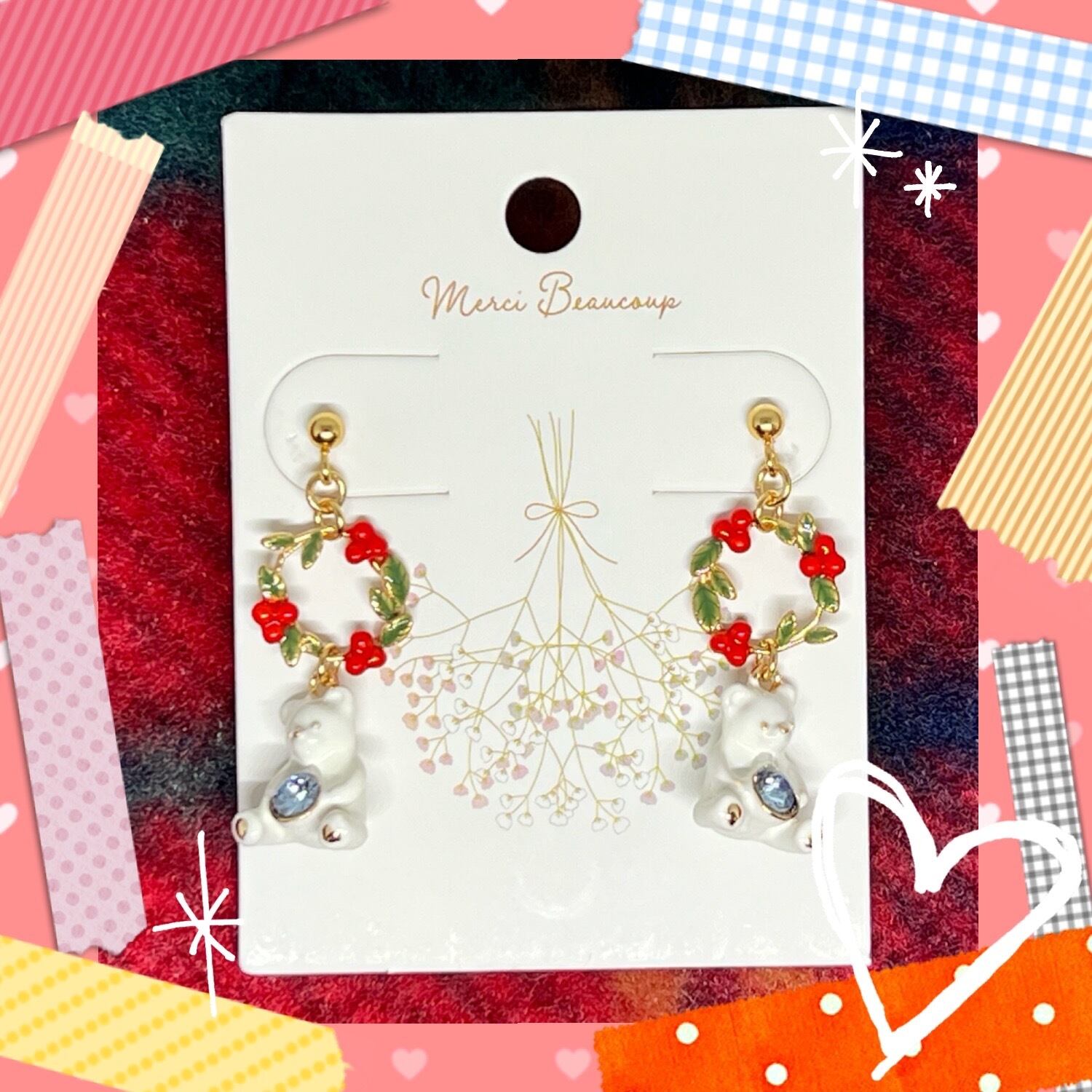 可愛いテディベアが耳元で揺れてとても愛らしいアイテムです。
