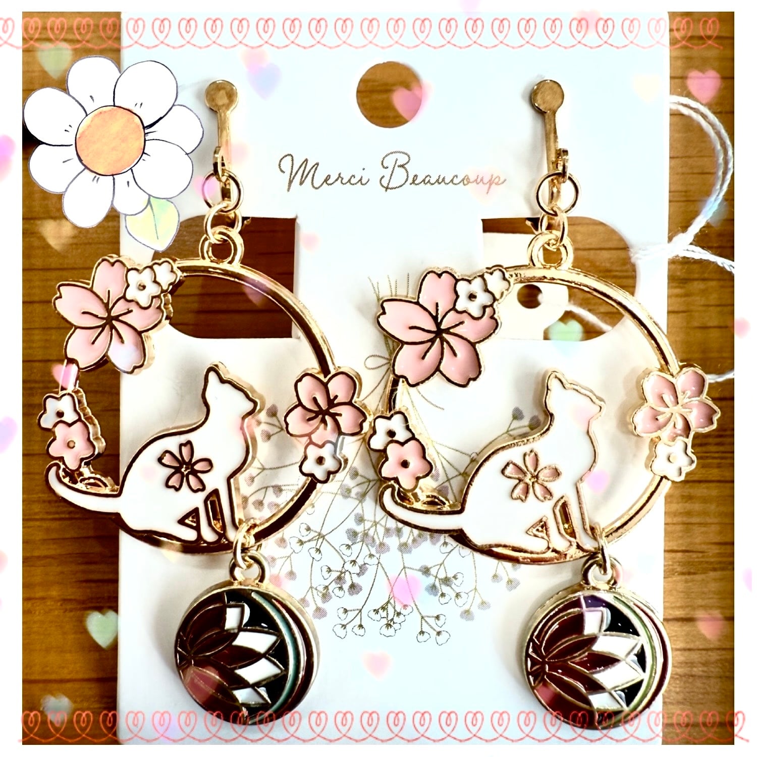 和風のイヤリング。桜で遊ぶねこと鞠が耳元で可愛く揺れます。
