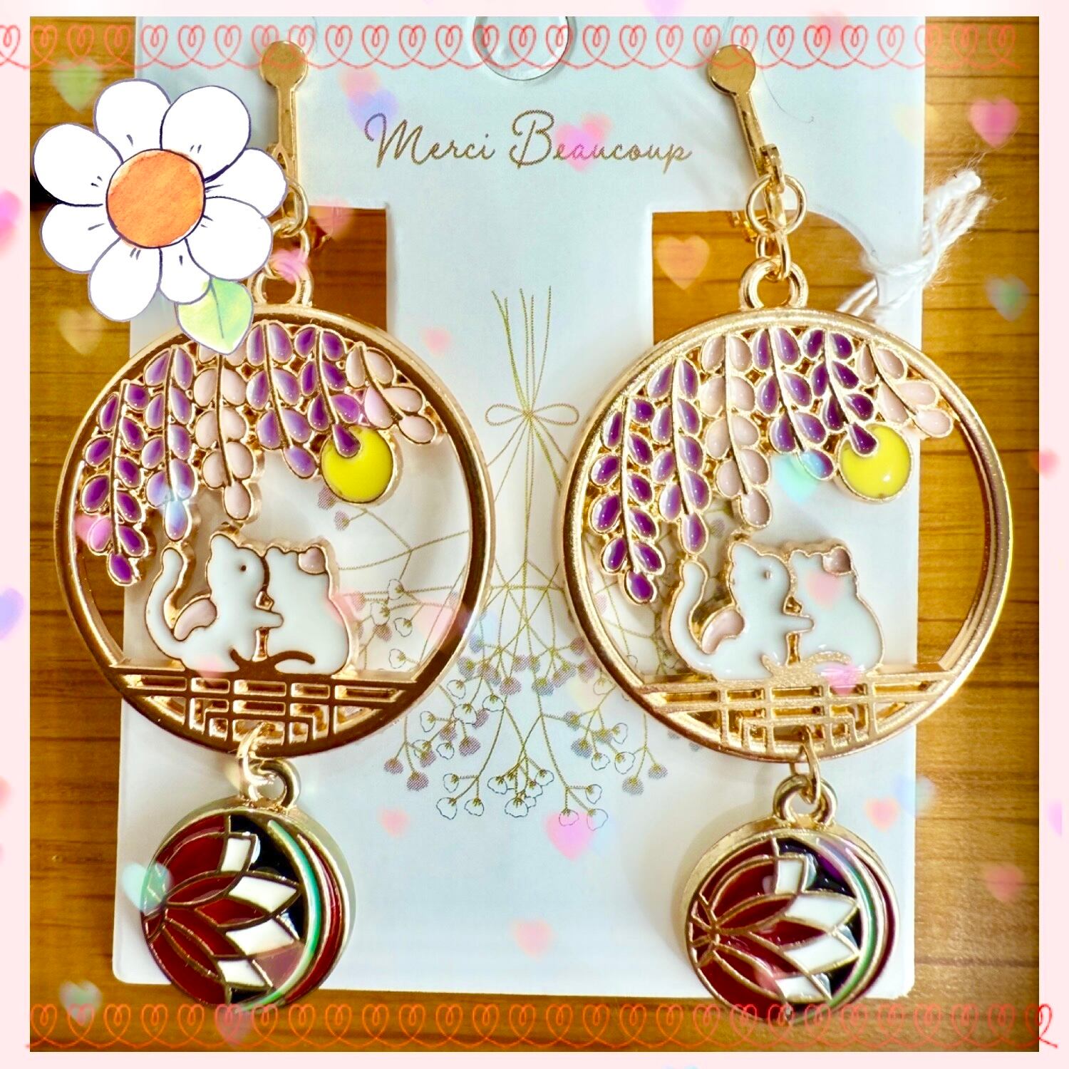 和風のイヤリング。藤の花を眺める二匹の寄り添うねこと鞠が耳元で可愛く揺れます。